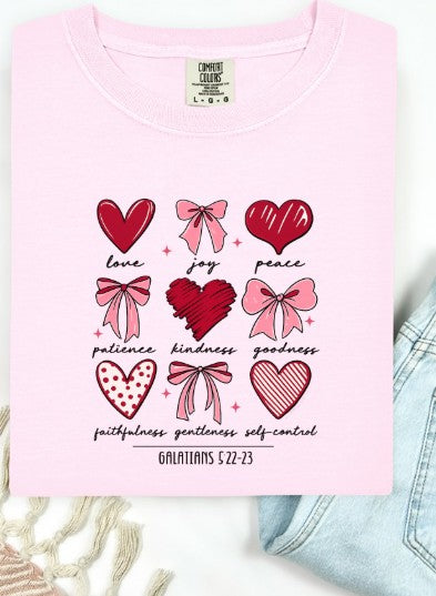 This tee celebrates Galatians 5:22-23 with a design that brings love, joy, peace, patience, kindness, goodness, faithfulness, gentleness, and self-control to your everyday wardrobe.