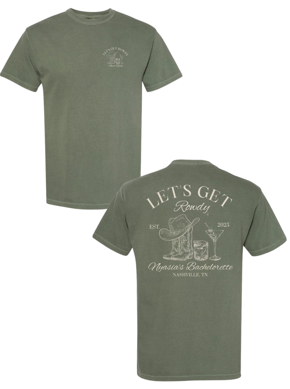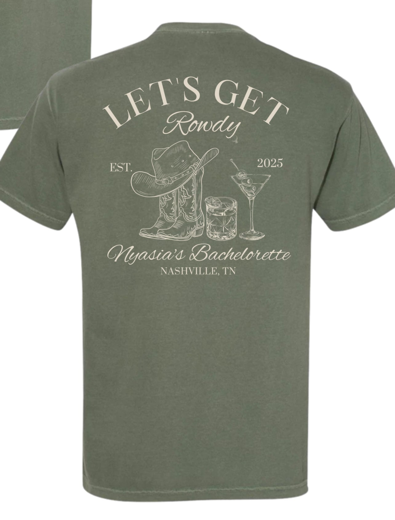 These shirts can be customized. Input the bride name and the party location in the custom request box.